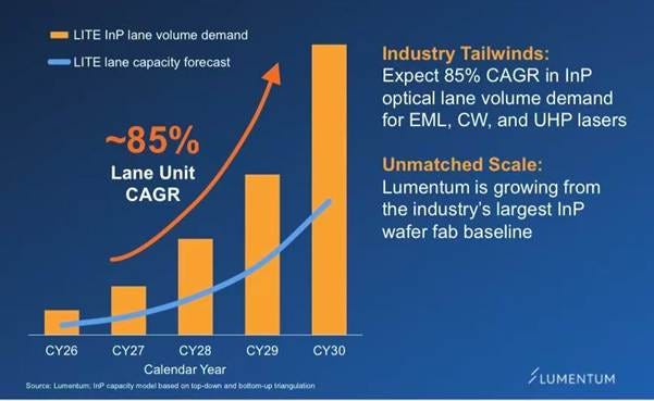 AI data center InP optical lane demand expected to grow at ~85% CAGR (CY26–CY30); Lumentum capacity forecast tracking closely (Source: Lumentum OFC 2026)