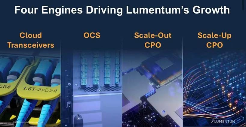Lumentum’s four growth engines: Cloud Transceivers, OCS, Scale-Out CPO, Scale-Up CPO (Source: Lumentum OFC 2026 Investor Briefing)