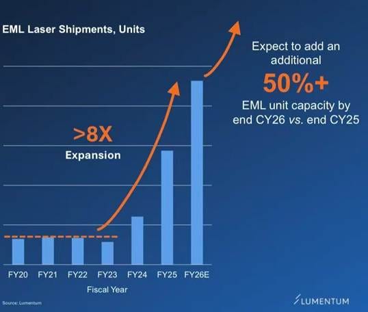 Lumentum’s InP manufacturing lead has crossed into true scale-driven barriers to entry: EML shipments expanded >8X from FY20 to FY26E, with plans to add an additional 50%+ EML unit capacity by end of CY26 vs. end of CY25.