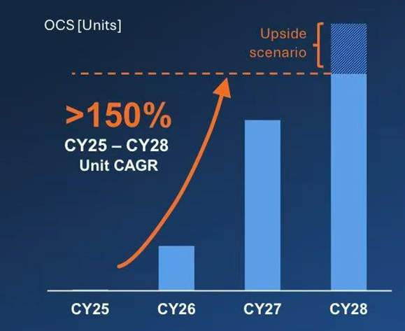 OCS is likely the most underappreciated part of the LITE story. The company has signed a new multi-year, multi-billion-dollar OCS agreement, with current order backlog exceeding $400M to be fulfilled in 2H CY26, targeting a >$1B run rate in 2027. OCS unit CAGR is >150% from CY25 to CY28.